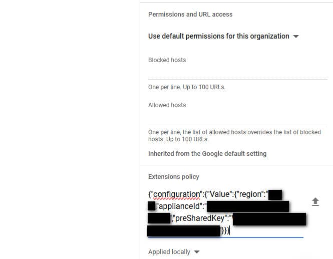 - Kopieer de Managed Config die u van Kliksafe ontving en plak het in Extensions Policy (zie figuur).